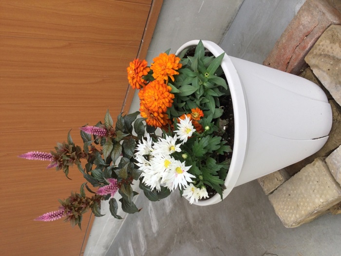 店舗入り口にお花の寄せ植えを飾りました🧡🧡🧡