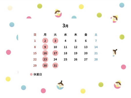 毎週月曜日と3・17・31日の火曜日がお休みとなります。
