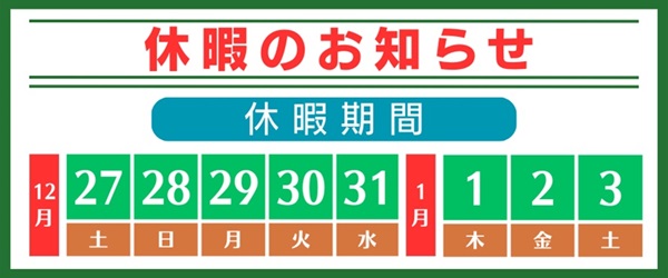休業中のお問い合わせにつきましては、1/4(日)以降にご返答いたします。