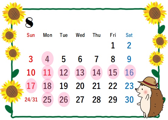 8月の営業日は以下の通りです😊