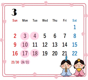 営業時間は9:30~18:30、●が付いてる日が店休日です😽